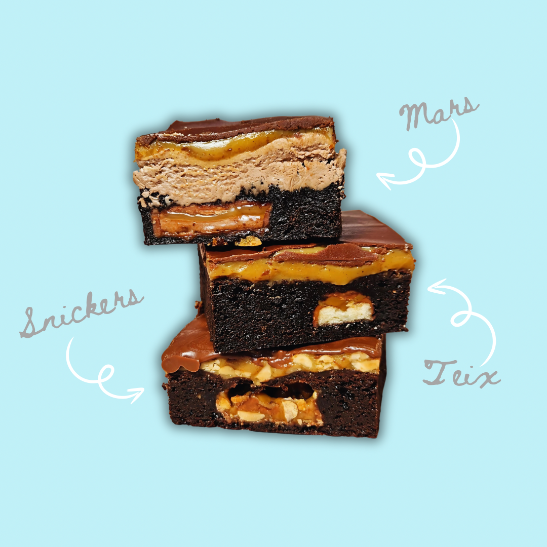 Why have one slab when you can have 3! This one isn’t for the faint hearted- fudge brownie, salt caramel, homemade nougat, peanuts, chocolate, buttery shortbread… the list goes on 🤤